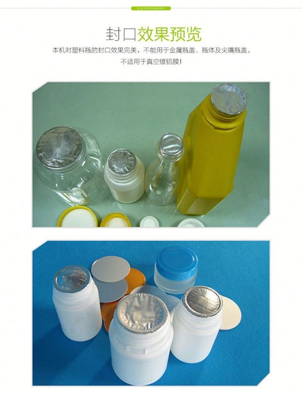 পোর্টেবল চৌম্বকীয় ইন্ডাকশন সিলিং মেশিন ব্যবহার ইলেক্ট্রোম্যাগনেটিক ইন্ডাকশন নীতির আনতে তাত্ক্ষণিক উচ্চ তাপ অ্যালুমিনিয়াম ফয়েল গলানোর জন্য bung গর্ত সংহত করতে,এটি ভিজা-প্রতিরোধী, ফুটো-প্রতিরোধী, ছত্রাক-প্রতিরোধী এবং বালুচর সময় বাড়ানোর লক্ষ্যে পৌঁছেছে। এটি ছোট ব্যবসা পরিচালনা এবং পরীক্ষাগার ব্যবহারের জন্য আদর্শ।বোতলের উপাদান গ্লাস বোতল এবং প্লাস্টিকের বোতল যেমন পিপি, এইচডিপিই, পিইটি ইত্যাদি হতে পারে।
