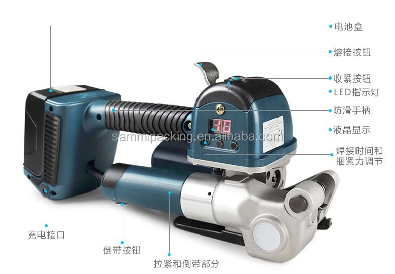 সুবিধাঃ a) প্যাকিং খরচ 15% এরও বেশি হ্রাস এবং প্রায় 2 গুণ কমপ্যাকিং তীব্রতা বৃদ্ধি b) ধাতু buckle ছাড়া প্যাকিং উন্নত c) কম শক্তি এবং সমাপ্তি জন্য অ্যালার্ম ডিভাইস সঙ্গে;d) ব্যতিক্রমী ধুলো-প্রতিরোধী ফিল্টার স্ক্রিনের সাহায্যে প্রচুর পরিমাণে ধুলো, ক্ষুদ্র ফাইবার এবং অন্যান্য ঘৃণ্য পরিবেশে স্বাভাবিকভাবে কাজ করে; e) হালকা ওজনের সাথে, একক হাতে পরিচালনা করা সহজ।